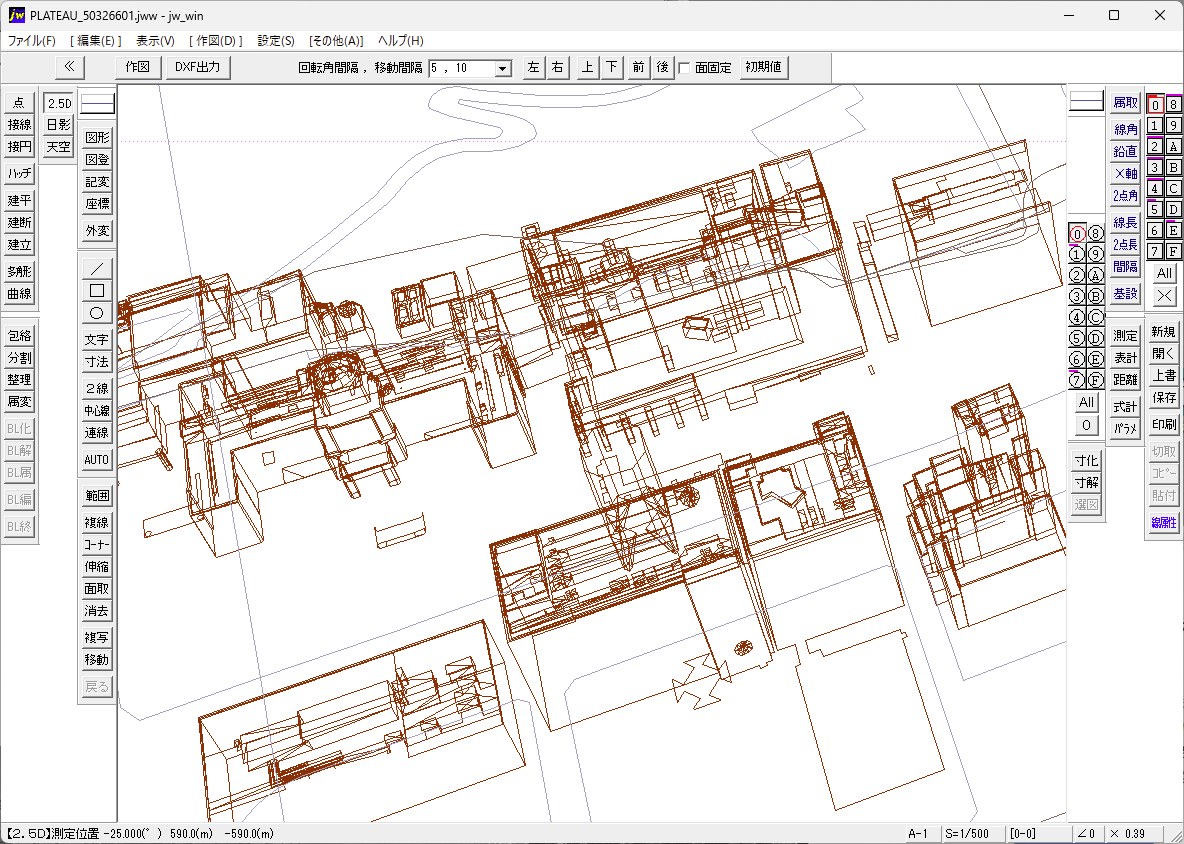 F)dem(Layer)のLOD1レイヤを解析して、Jwwの2.5Dデータを付加して、地形データをJw_cadのデータとして活用できる。