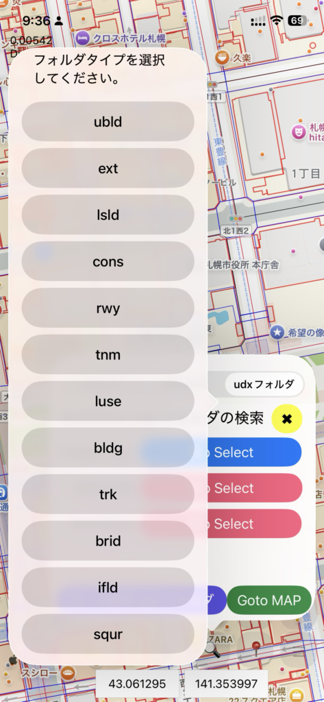 A)現在完成している部分は、ストリーミングのJSONのインデックスを読み込み、目的のCityGMLをダウンロードし解析を行い、bldg(Layer)のLOD0とLOD1とLOD2を表示、tran(Layer)のLOD1をiOSのMapViewにオーバーレイ表示しています。
