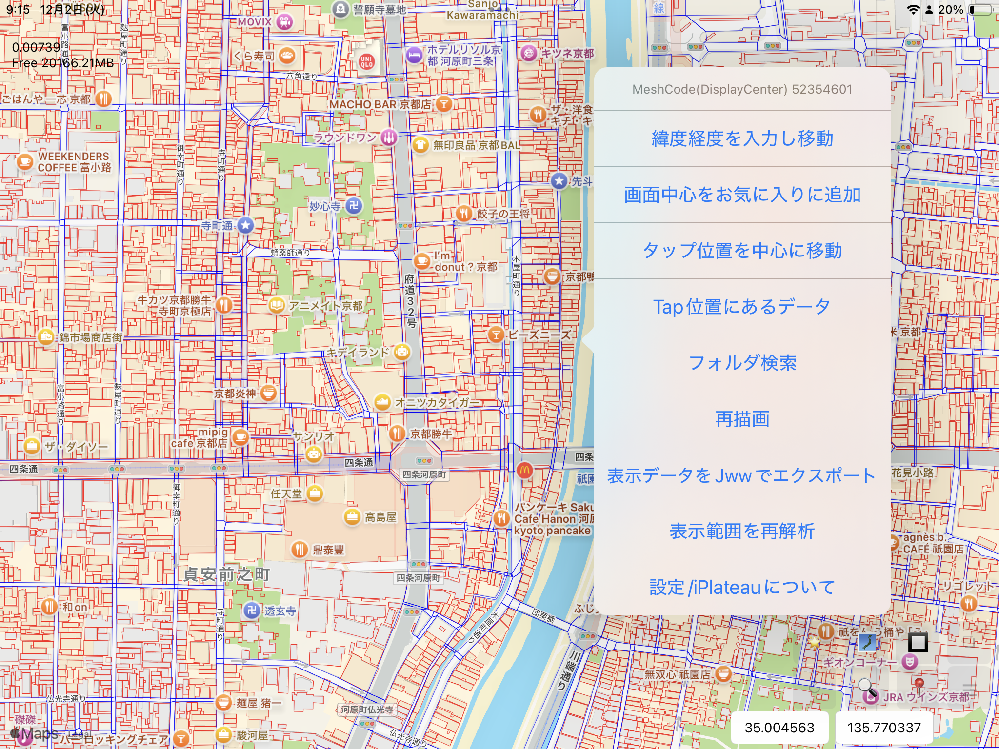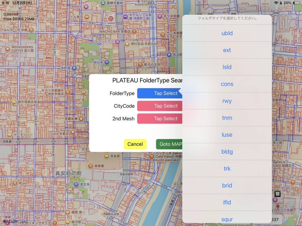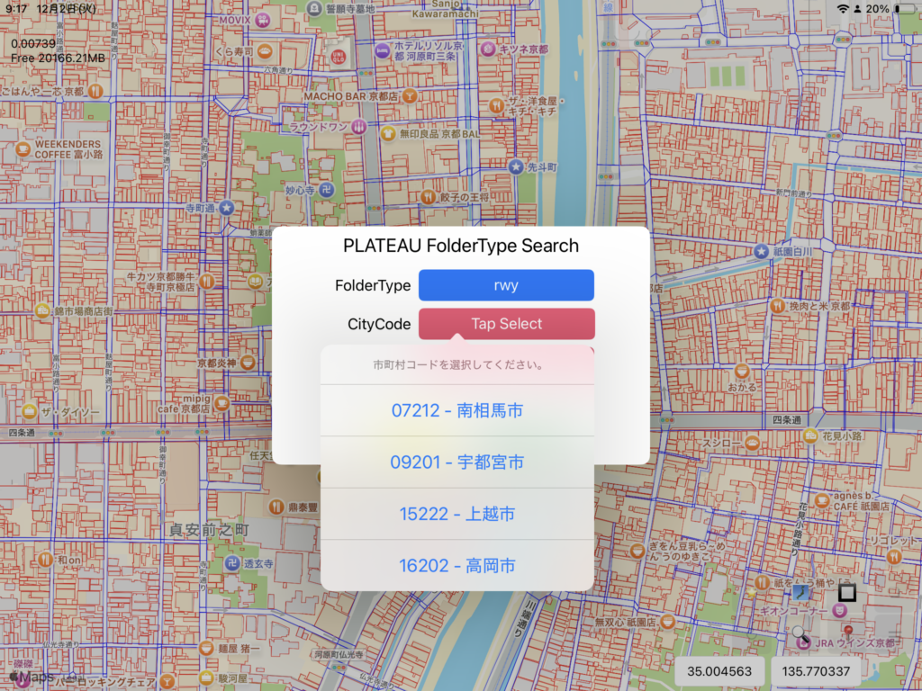 初回起動直後の画面には京都府を中心にした2次メッシュコードが表示されます。2次メッシュとは一辺が約10kmの区画を表します。iPlateauでは6桁の数字で表されます。ズーム操作はiPhone/iPadの標準のマップアプリと同じです。ピンチ操作で拡大すると、2次メッシュコードの下に、その区画に存在するフォルダタイプ(iPlateauではレイヤと表記する場合もある。)が表示されます。どの区画に、どんなデータが提供されているかが一目でわかります。