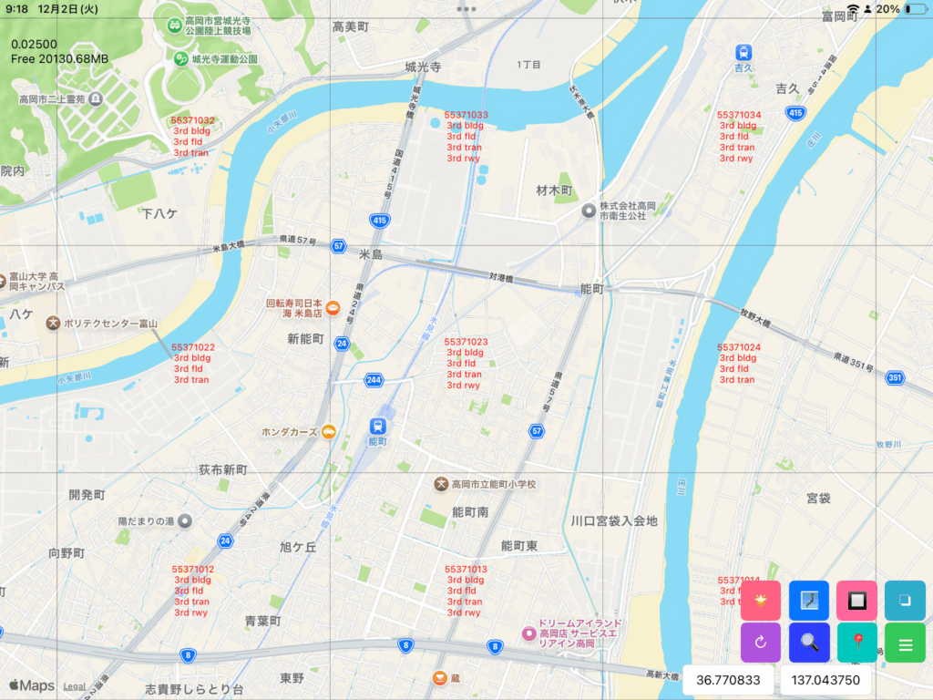 このように、リストの中をタップすることでデータの表示のオンオフができます。「2nd:地形(標高)」は、2次メッシュの、地形データです。地形データ「demフォルダ」は非常に大量のデータがあるため、かなり重くなります。参考までに、「2nd:地形(標高)」を表示させた場合を示します。